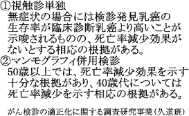 がん検診の適正化に関する調査研究事業では、視触診単独乳癌検診では、無症状の場合には検診発見乳癌の生存率が病院で診断された乳癌より高いことが示唆されるが、死亡率減少効果がない。(表(1))一方、MG併用検診については、50歳以上、更に、40歳台でも、死亡率減少効果を示すとしている。(表(1))