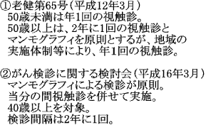 平成12年3月31日、老健第65号「がん予防重点健康教育及びがん検診実施のための指針」の一部改正で、「50歳以上の女性に対しては2年に1回のMGと視触診による検診を原則とし、50歳未満の女性に対しては年1回の視触診を行う」という通達があった。この結果、乳癌検診の基本は、従来の視触診単独から、MG併用検診と大きく変化した。しかし、同じ通達の中で、「地域の実施体制などを勘案して、MG検診を実施しない場合、年1回の視触診をする」としていたため、乳癌検診の主体は依然視触診であると考える自治体が多かった。(表(2))ところが、平成16年3月、厚生労働省のがん検診に関する検討会は、老人保健事業に基づく乳がん検診及び子宮がん検診の見直しを行い、MGによる検診を原則とし、検診対象年齢は40歳以上、検診間隔は2年に1度とするなど、乳癌検診の中心はMGであることを明言した。(表(2))従って、全ての自治体で乳癌検診をMG併用検診にする必要がある。