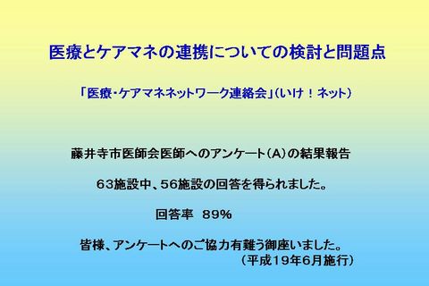 平成18年度から、藤井寺市地域包括支援センター、藤井寺市医師会、藤井寺市歯科医師会、藤井寺市薬剤師会、藤井寺保健所、藤井寺市介護保険事業者連絡協議会などを中心に、医療・福祉・ケアマネジャーの連携を強化し、患者さん・利用者さんが、十分な医療と介護サービスを受けられるように、医療・ケアマネネットワーク連絡会(いけ!ネット)を立ち上げました。